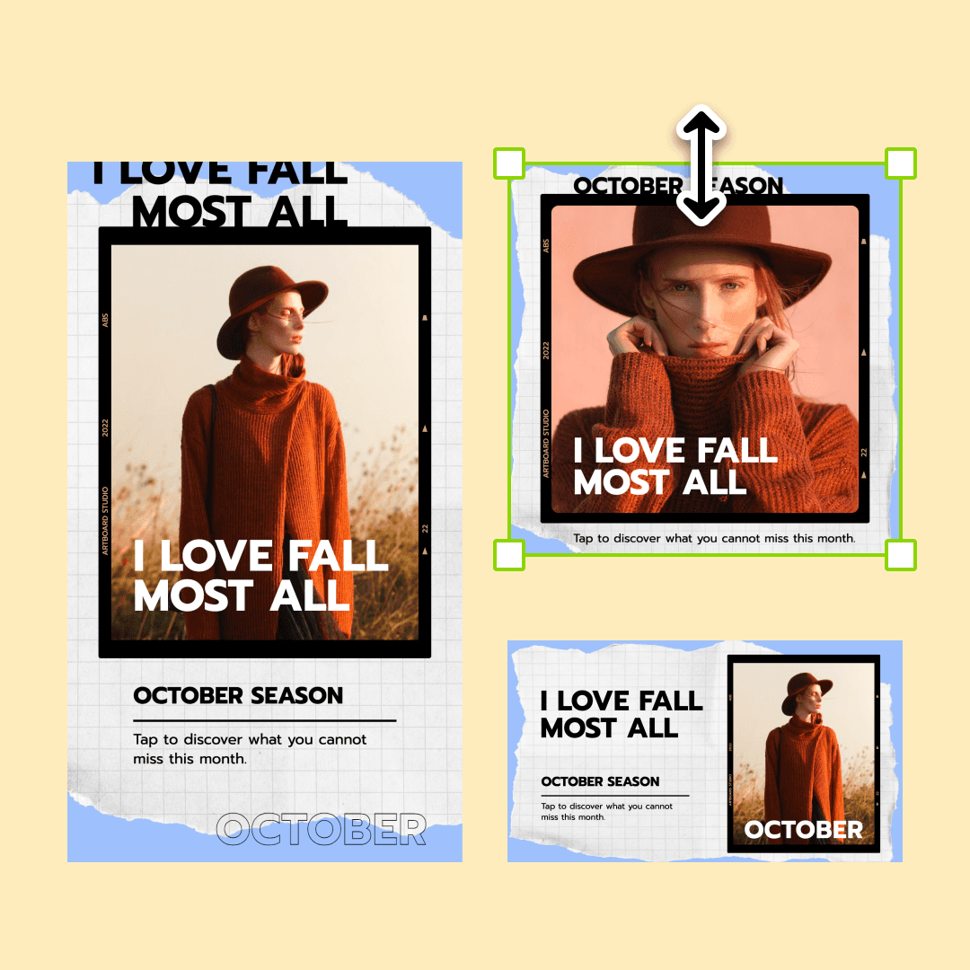 Resize designs or videos effortlessly. Create one master design, define object positions, and generate multiple ratios for any platform.