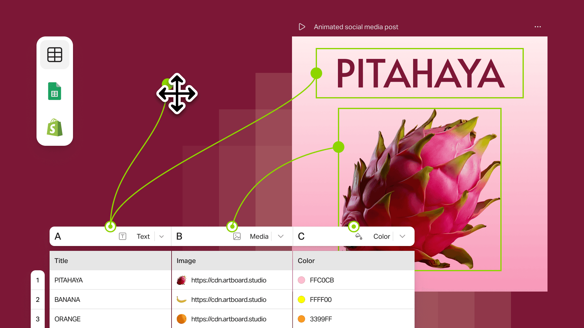 Connect a data feed or create your own table, assign it to image, video, color, and text elements, and instantly generate variations. No more manual design duplication.